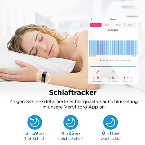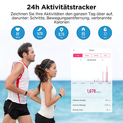 Herzfrequenzmessung&Schlaf Tracking: Dieser Fitness Tracker kann die Herzfrequenz automatisch und kontinuierlich 24 Stunden lang überwachen. Sie können das Diagramm für die dynamische Herzfrequenzkurve für den ganzen Tag in der App anzeigen.Erkennt automatisch Ihren Schlafrhythmus während 21.00 bis 8.00 Uhr und analysiert Ihre Schlafqualität mit Tiefschlaf, leichtem Schlaf und Wachschlaf, um die Schlafqualität zu verbessern