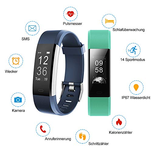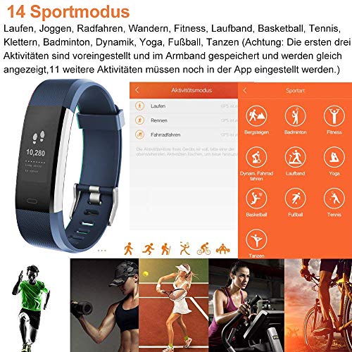 ▶Fitness Tracker mit 14 Trainingsmodi: Laufen, Joggen, Radfahren, Wandern, Fitness, Laufband, Basketball, Tennis, Klettern, Badminton, Dynamik, Yoga, Fußball, Tanzen(Achtung: Die ersten drei Aktivitäten sind voreingestellt und im Armband gespeichert und werden gleich angezeigt,11 weitere Aktivitäten müssen noch in der App eingestellt werden.)