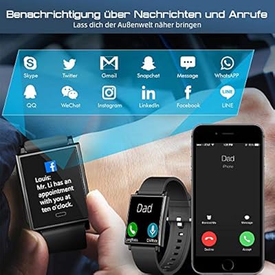 【Intelligente Funktion】Fitness Tracker, 24-Stunden-Dauerherzfrequenz und Blutdruckmessgerät, Schlaf-Monitor, Pedometer, Kalorienzähler, Schrittzähler, Bluetooth Phone Call Reminder, Name des Anrufers Anzeige, Anruferanzeige, beantworten Ablehnen das Telefon, Call & SMS-Nachricht Benachrichtigung, Health Tracker, Sitzende Erinnerung, Remote-Kamera, Alarm, Countdown, Stoppuhr.