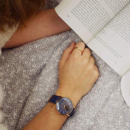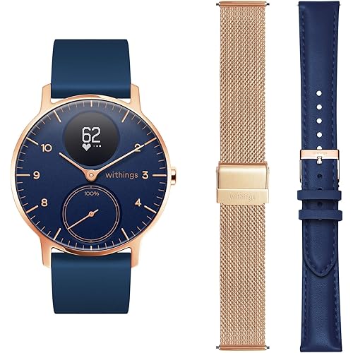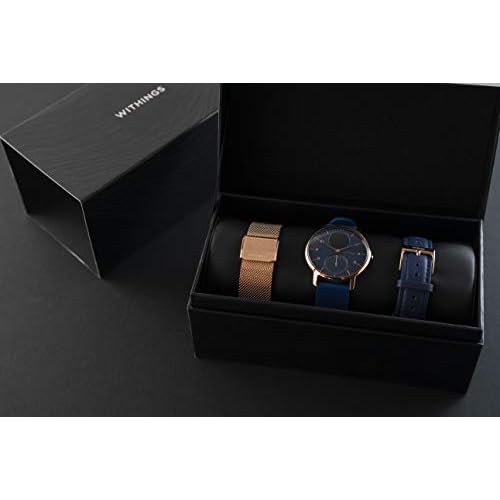 Dieses Geschenk-Box von Withings enthält: 1 x Armbanduhr Steel HR Rose Gold 36mm blaues Zifferblatt, blaues Silikonarmband + 1 x Armband Milanaise roségold + 1 x Armband Leder blau
